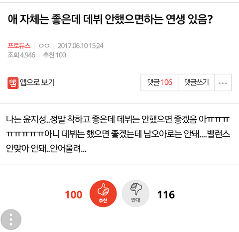 팬톡공지본인간들맞냐.... 개인취향을굳이올려서 좋지도않은글을쓰는건뭐야 내연생댓글에있다고생각해봐 진짜짜증날거같음