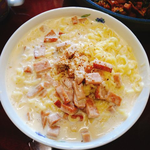 그리고 라면이나 라면사리면 끓이고 소스만들었던거에다가 면넣고 휘저으셈 마지막에 후추가루 넣어도 맛있음 그럼 크림스파게티 완성임 스팸이나 베이컨 구워서 넣어두 개맛있음 진짜 크림스파게티 맛 나는데 좀더 고소한맛임