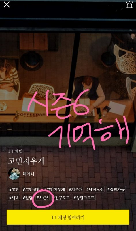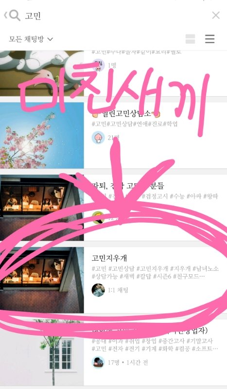 우선 옾챗방에 고민이라고 치고 쭉 내리다보면 저렇게 나와 나랑 엎챗할때는 카카오캐릭터로 해놨는데 모델분으로 해놓음 ㅇㅇ