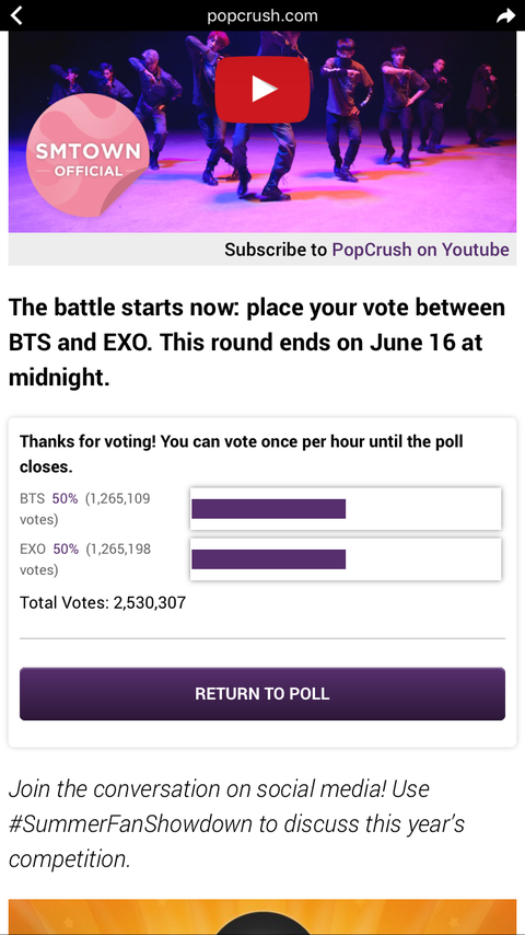 지금 왔다갔다 하고 있음 다들 투표하러 http://popcrush.com/bts-vs-exo-2017-summer-fan-showdown-round-2/