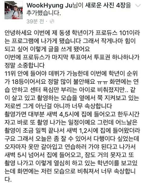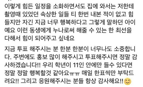 학년맘인데 이 사건을 계기로 죽도록 까이면서 느낀건 내가 진짜 학년이를 사랑하는구나 하고 느꼈어 까가 빠를 만든다고 더 단단해진 것 같아 다른 학년맘들도 그렇게 느낄거야 학년이 앞으로 더 열심히 해서 성장하고 발전하는 모습 보일거야 저렇게 열심히 하는데 안늘고 배기겠어? 학년이 계속 믿어줄꺼야 프듀가 아니더라도 학년이의 앞날을 계속 응원할꺼니까! 같이 가자 학년아 나쁜 거 보지 말고 예쁜 것만 봐 내새끼