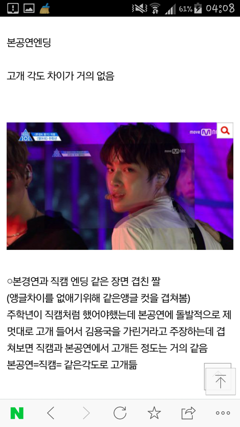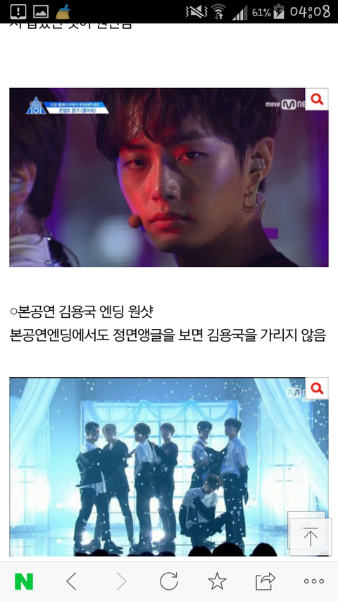 용국이 엔딩 원샷에서 가리지 않았고, 아래 엠카 무대 사진에서도 고개를 들고 있지ᅟᅡᆫ 센터를 가리지 않았습니다.