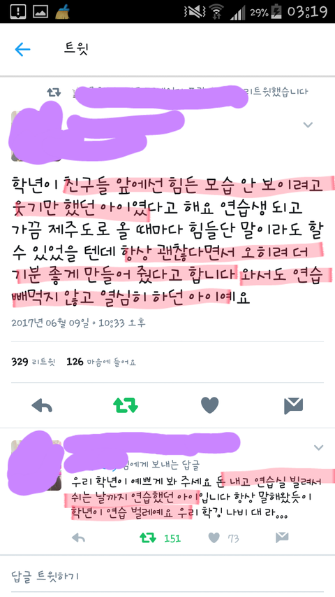 학년이가 방송에서 논란이 될 때마다 올라온 글들을 모은것인데요.. 하나같이 열심히 노력하고 착한 아이라고 말합니다. 방송에서의 모습보다 평소 모습이 진짜라고 전 생각합니다..