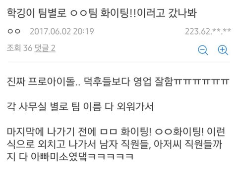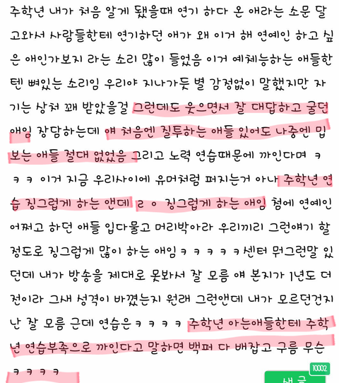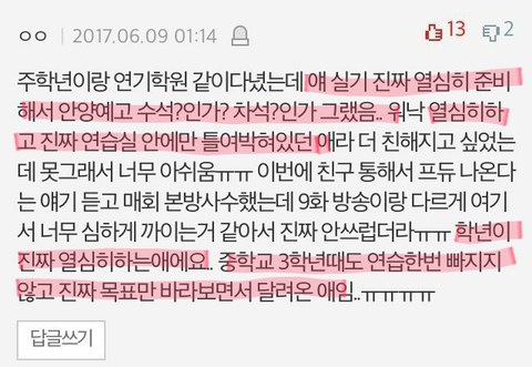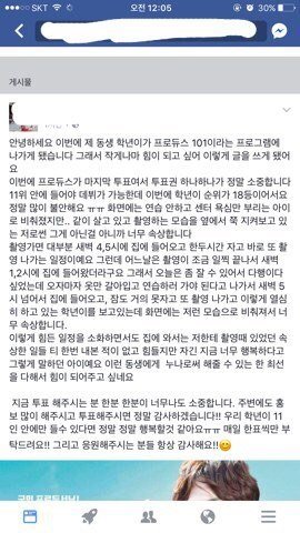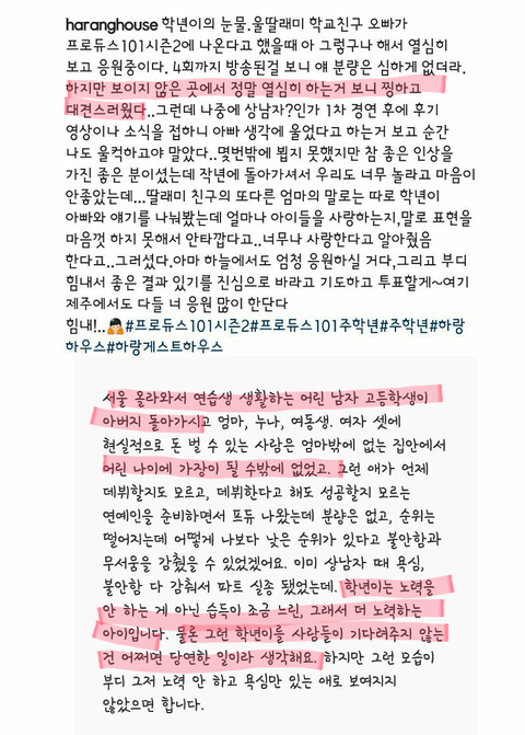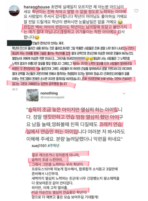 제 글이 얼마나 도움이 될지는 모르겠지만.. 이제 그만 비판을 가장한 비난은 삼가주시고 프로듀스 연습생들 모두를 응원해주셨으면 좋겠네요..긴 글 읽어주셔서 감사합니다ㅜ