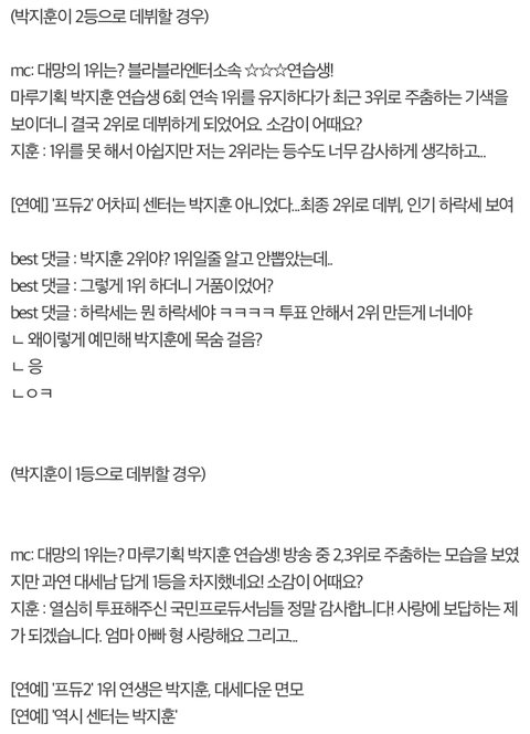 1인1픽 됐으면 당연히 최애 뽑아야지 차애 뽑는 사람들은 뭐야..? 그건 그냥 최애가 지훈이가 아닌 거야ㅋㅋ 문자투표 때는 머글 대거유입 될텐데 시즌1에서 문자1=투표7이었던 건 알지? 근데 지훈이 분량도 없고 파트도 래퍼2야. 이럴 때일수록 코어는 결집해서 투표 쌓아놔야 한다구
