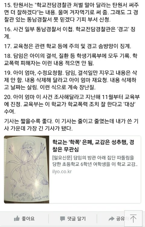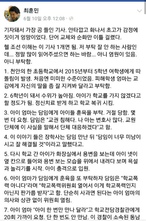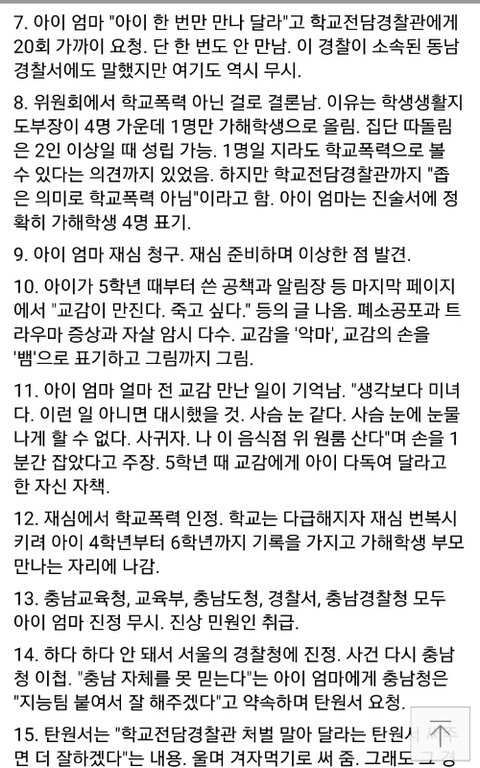 그리고 담임과 교감, 교육 공무원, 경찰 등 관련인이 처벌 받기를 바랍니다. 제발 솜방망이 처벌이 아닌 직위해제 이상이길 바랍니다. 이들은 선생 자격이 없습니다. 이들이 처벌 받는다고 학교가 달라지진 않더라도 본보기가 되서 존경받는 선생님이 많아 졌으면 좋겠습니다.
