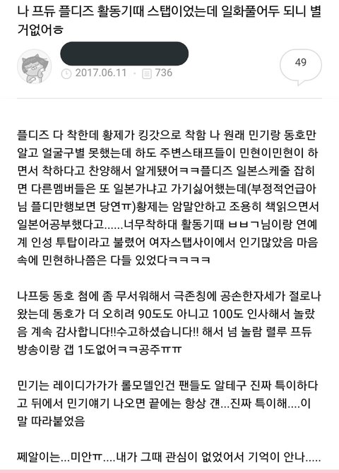 황민현은 민기 엉덩이도 쳐주고 종현이는 뭔가 울음 참는거 같기도 했고ㅠㅠ아마 민기가 맘고생이 심했을거임 플디즈 중에 순위가 제일 낮았었기 때문에ㅠ