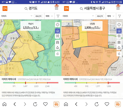 지도로 그 위치의 시세나 실거래가 색깔로 표시가 되네요.