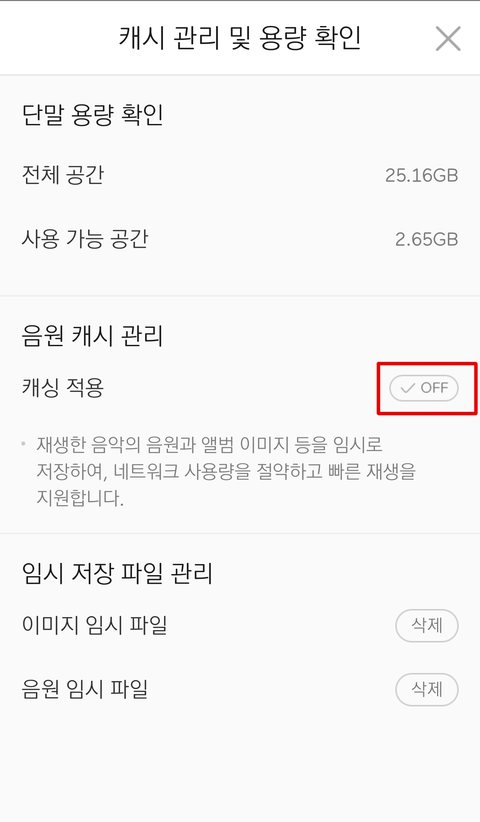 (타 음원 사이트도 마찬가지로 설정에 들어가서 재생설정에 임시 저장 파일/캐시 이런말있는거 들어가서 끄면됨!)