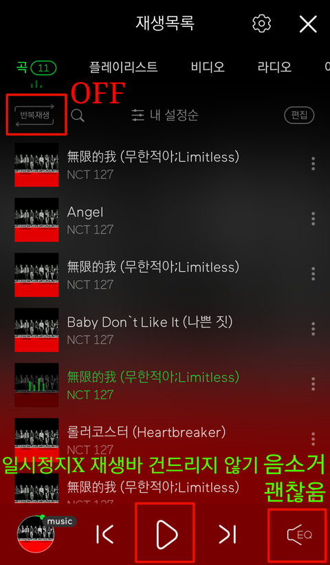 이때 저 반복재생 꼭 OFF!!