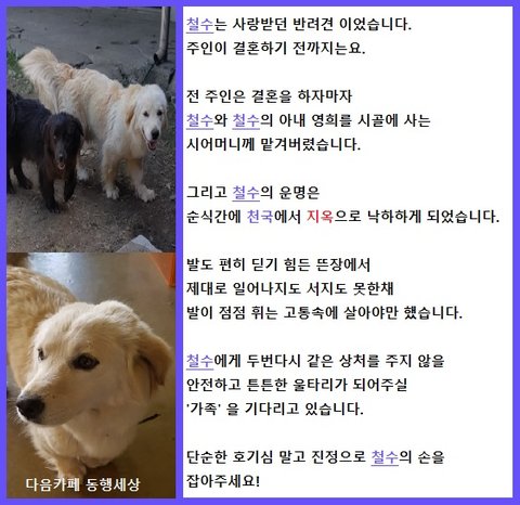 철수는 뜬장에서 내려오는것을 무척이나 무서워 했습니다.
