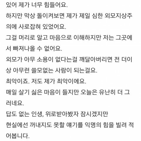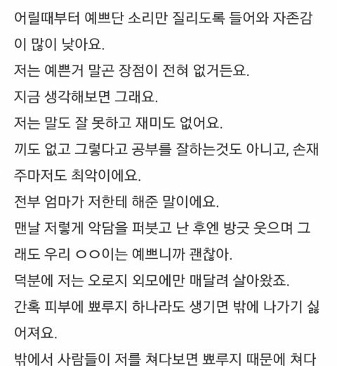 솔직히 진짜 예쁜 애들은 너무 공격당하면 자존감 떨어질 순 있어도 마음 속 한 구석에 하여간 얼굴도 인성도 못생긴 것들이 ㅉㅉ.. 라는 생각 하고 살 거 같다.... 아무리 그래도 자기도 눈이 있는데 자기 이쁜건 알 거 아닌가...ㅇㅅㅇ... 그래서 솔직히 속으로 되게 우습기도 하고 재밌기도 하고 같잖기도 할 거 같음..ㅋ.. 너무 공격하면 자존감이야 떨어져도 한편으론 진짜 웃길 거 같음.. 주변에 열폭하는 사람들 보면 진짜 애잔하고 우습게 보일 듯..... ㅇㅅㅇ.. 아닌가.. 공부 잘하는 사람들도, 집 잘 사는 사람들도 솔직히 자기 공격하는 사람들 보면 열폭ㅉ.. 이렇게 느낄 거 같은데..