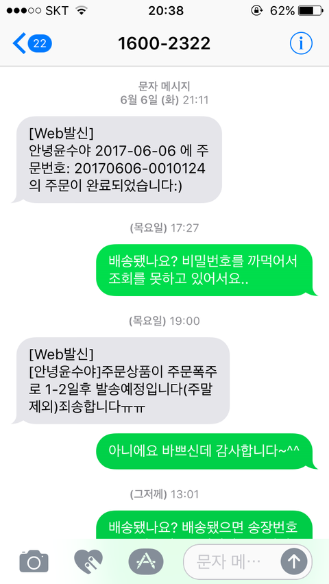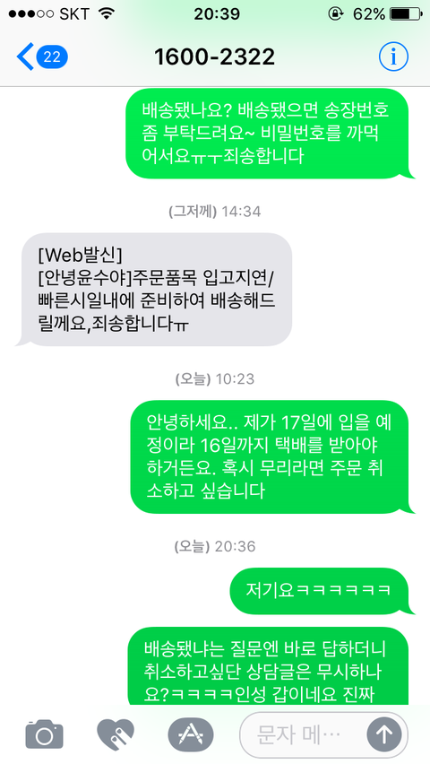 6일에 주문했는데 언제 배송 되냐고 물으니까(저 번호가 문의 번호야. 발신 전용 번호 아님)