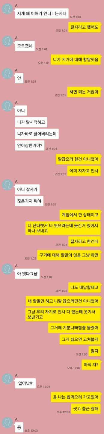 a가 잔대서 게임에서 잘자라고 인사한 다음의 대화내용이예요.