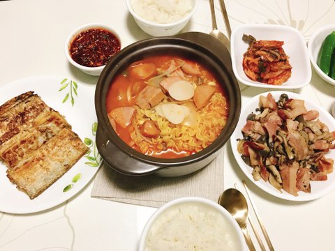 부대찌개랑 갈치구이, 느타리 베이컨 볶음이에요.