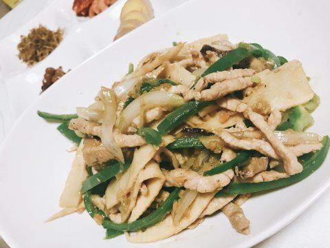 피망이랑 돼지고기 죽순 양파 표고 각각 소금 후추간해서 볶고 다 합친후 굴소스 넣구 볶아주고 마지막 참기름 한바퀴~~