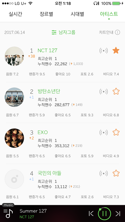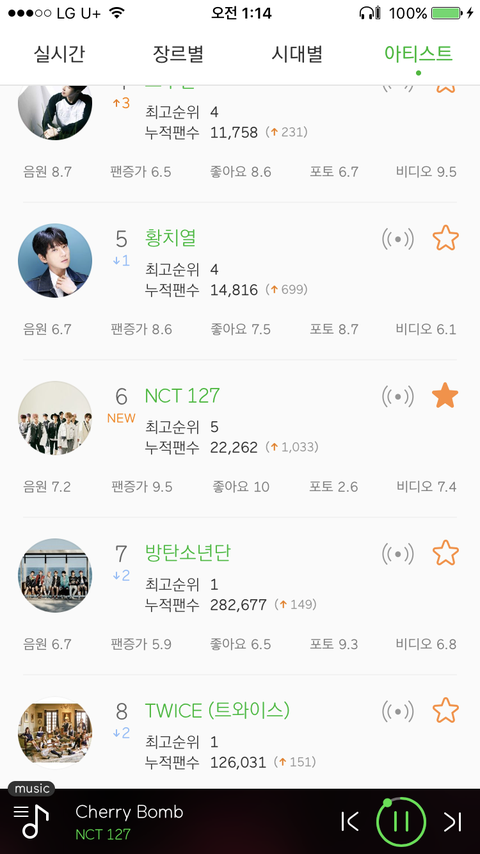 아랫사진 전체가수 팬증가 6위