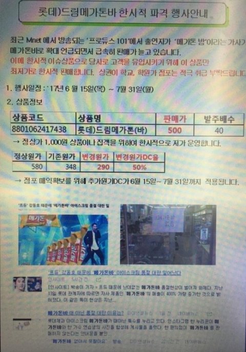 편의점 GS25 측은 최근 점포주들에게 '롯데 드림 메가톤바 한시적 파격 행사안내'라며 "Mnet '프로듀스101' 시즌2에서 출연자(강동호)의 가사 '메가톤 밤'이 메가톤바로 확대 언급되면서 급속히 판매가 늘고 있다. 한시적 이슈상품으로 당사로 고객을 유입시키기 위해 최저가 판매한다"고 알렸다.
