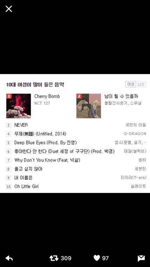 10대 여성 많이들은음악 1위