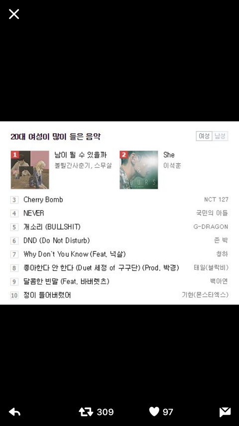 20대 여성 많이들은 음악 3위래 대박