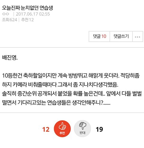 아니 ㅋㅋㅋ배진영 예전에는 조용하다고 욕햇으면서 이제는 밝아지는깐 나댄다고욕함? 니들 백퍼 배진영이 저렇게 축하안해줫으면 또 배진영 싸가지없다고 ㅈㄹ할꺼잖음 ㅋㅋㅋㅋ졸ㄹ 웃기는새끼들이네 앞뒤말쫌 어울리게 말해 무턱ㄷ데고 애 까지말고.