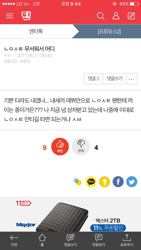 우리가 타연생 패고 그랫음?? 나진짜 어제 계속 ㅇㅌ에 있엇는데 못봣거든 아나진짜 억울해 피해자프레임 덮어씌운다고 하고 정작 부기픽인 나는 그냥 덤덤하게 잇는데 단톡방에서 타픽인 친구들이 더 난리낫엇고만..