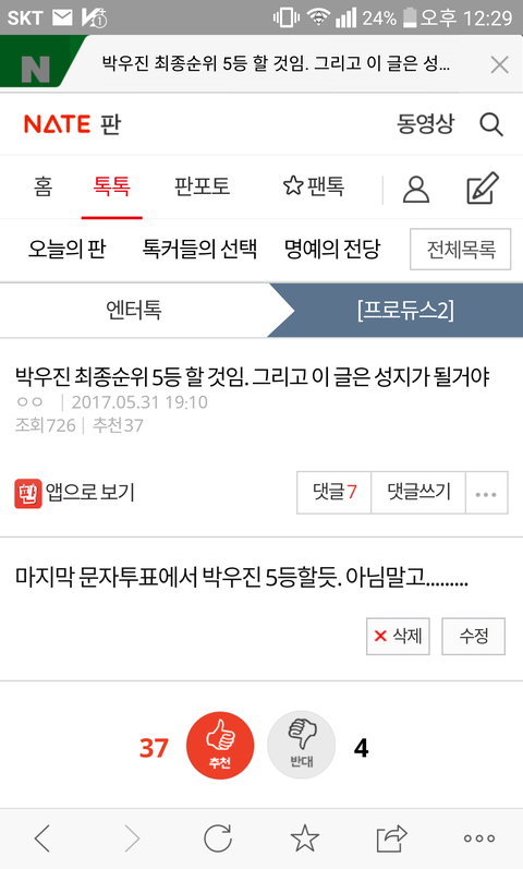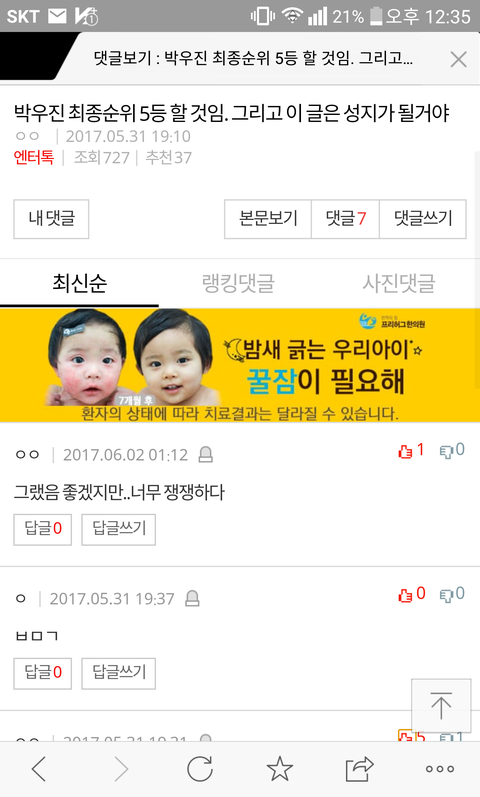 원래5등이엿을듯..뭔가 우진이5등할것같아서 첨으로 쓴글인데 댓글이 다들 아니라고 그럈는대 최종6등!너무 뿌듯하다