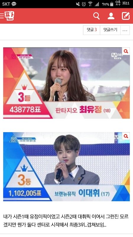 똑같은 3등인데 표차이봐..시즌1 3등 최유정 투표수보다 시즌2 17등 유선호 투표수가 더 많음