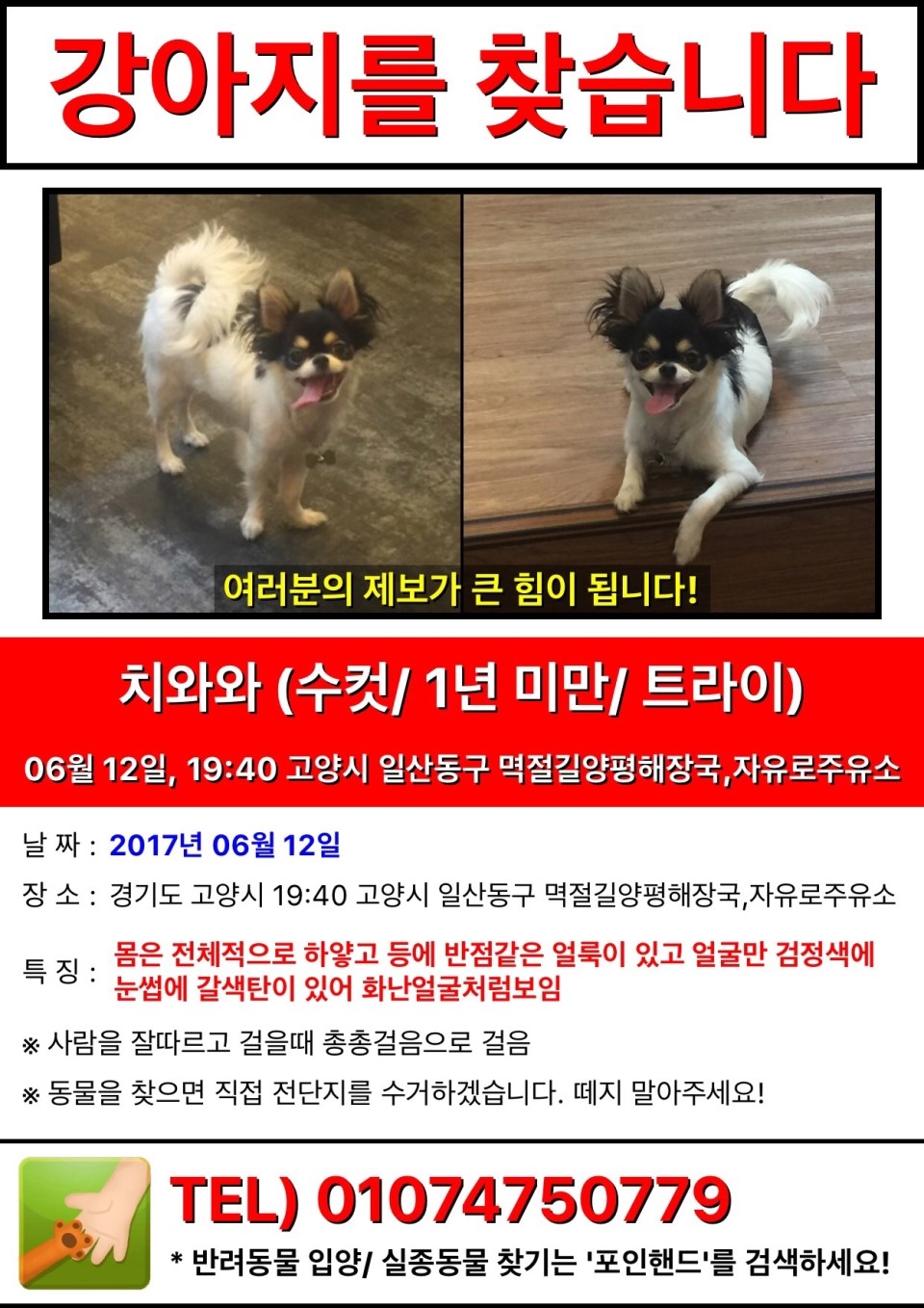 다음날 주변가게를 돌아다니며 전단지를 붙히고 동물보호센터나 소방서, 경찰서 ,일산에(화정,백석,마두) 동물병원20곳정도 다 전화해놓고 자주가는 애견카페,애견샵 에도 전단지를 드리고....호수공원 사무소에도 전화를 해놨는데....없어진지 4일째인데 아직....연락이 없내요 ㅠㅠㅠ전단지를 돌리다가 주변에 cctv가 없어 여기저기 수소문 하던끝에 한가게에서 cctv가 있다고 하셔서 얼른 봤습니다 ㅠ 그랬더니......없어진날 cctv 확인결과....아이는...7:47분에 나가고.......제가 바로 10분!!!뒤에 나왔더라구요 ㅠㅠㅠㅠㅜㅠㅜㅠㅜ억장이 무너집니다..ㅜㅜㅜ목걸이도 기침을 너무 많이해서 잠시빼놨었는데....그 사이에 나가버리고..........아직 9개월밖에 안됬는데....아무것도 모르는 아가입니다...ㅠㅠㅠ꼭 찾아주세요ㅜㅠ 다른 카페에서는 백석쪽 호수로나 화정에서 본것같다고도 하시는데....보시면 꼭 잡아서 연락주세요 ㅠㅠㅠ애교도 많고 사람도 좋아하지만.....치료를 받아야하는 병이있어..얼른 치료를 받아야합니다,ㅠㅠㅠ...부탁드리겠습니다....ㅠㅠ