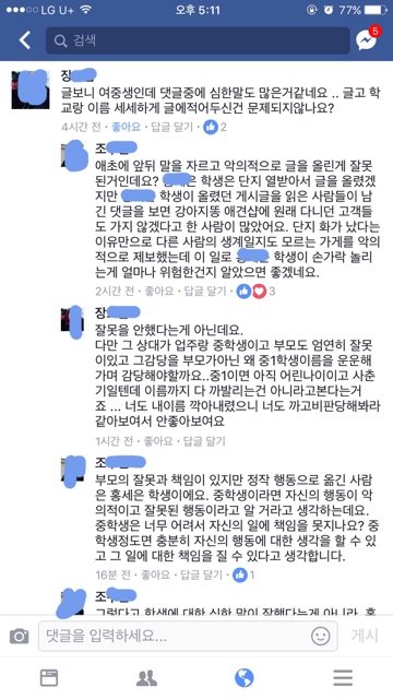 의문입니다. 어른 상대로 허위 글을 올렸다며 개념 없는 학생으로 몰리게 되었고 이런 저런 글의 문자도 많이 받았습니다. 학교 가기 싫다며 우는 모습을 보니 너무 속상합니다.