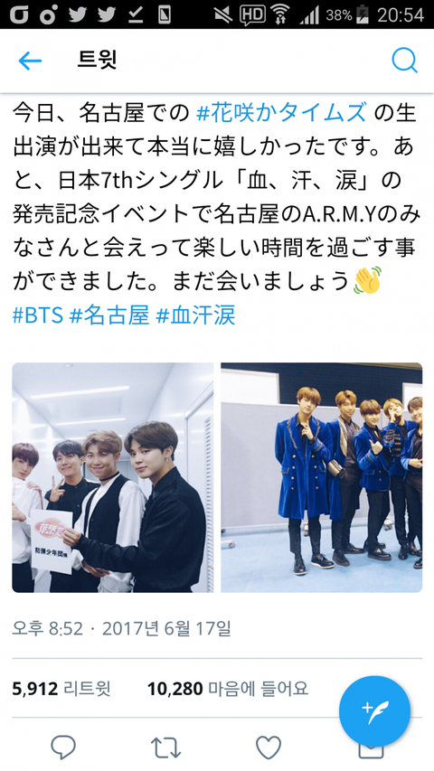 오늘 나고야에서 #하나사카타임즈에 출연할수있어서 정말 기뻤습니다. 그리고 일본 7th 싱글 「피땀눈물 」 발매 기념 이벤트에서 나고야 A. R.M.Y 여러분과 만나서 즐거운 시간을 보낼 수 있었습니다.또 만나요