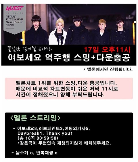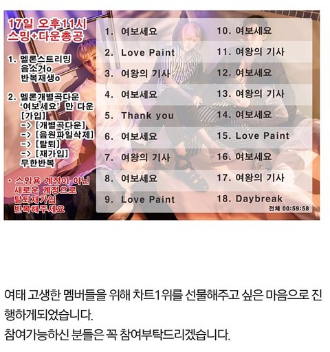 그저 단지 차트에 올라온 걸 볼 수만 있다면그리고 그걸 보고 좋아해 준다면그 이쁜 얼굴에서 웃음 꽃을 볼 수 있다면자기들이 끝난게 아니라는 걸 알게 된 다면그래서 우리들이 받았던 마음을 고마움을 전할 수 있게 된다면