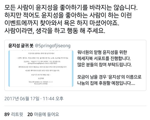 까빠들이 엠엠오를 왜 싫어하는지 이해도 안될 뿐더러 이해 하고 싶지도 않아 하지만 저 분 말대로 ㅁ모든 사람들이 윤지성을 좋아하는건 바라지도 않아 근데 그 말이 까도 된다는 소리가 아니잖아ㅋㅋㅋㅋㅋㅋㅋ