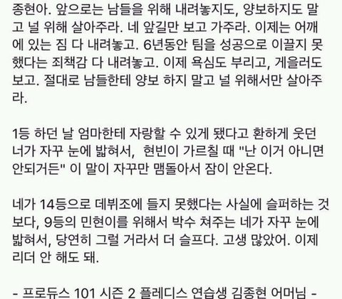 김종현 어머니가 쓰신 편지래..ㅠㅠㅠㅠㅠㅠ