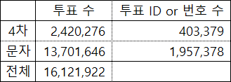 4차 투표 수와 문자 투표 수를 계산해 보면 아래와 같이 나눠질 수 있음
