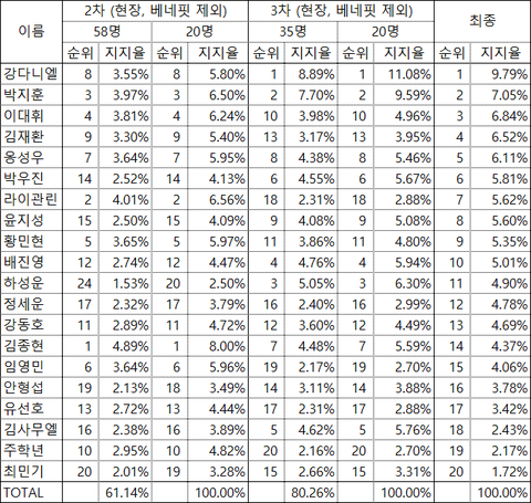 2차, 3차의 경우 현장, 베네핏을 제외한 투표수를 바탕으로 20명의 순위와 지지율,