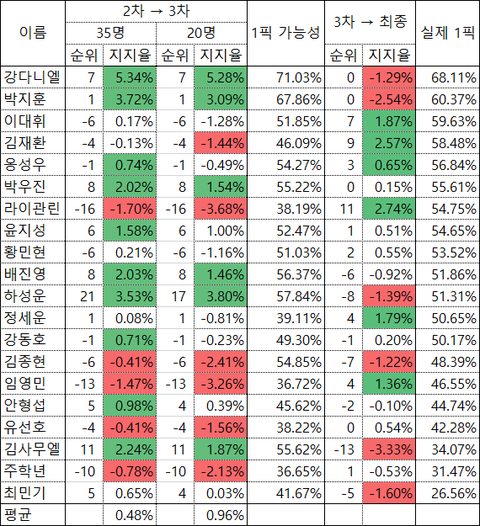 2차에서 3차로 넘어오면서 전체 35명에서의 지지율 증감과 TOP 20에서의 지지율 증감,