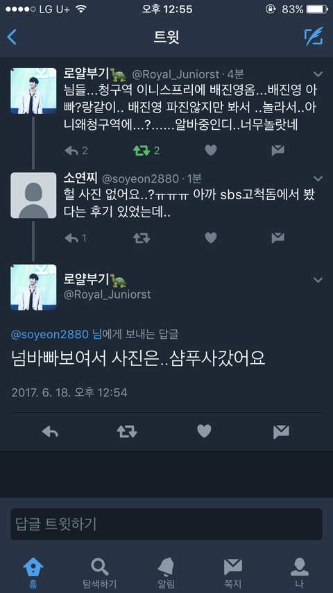 한시간전쯤이래ㅠㅠㅠㅠ 엄청 바빠보엿다는데 숙소생활땜인듯 ㅠㅠㅠㅠ