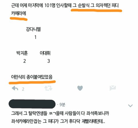 일단 오해하지 말아야할게 좌석이 아닌 피디 카메라에 붙여져 있다고 했음 사실상 카메라에 그 종이가 붙어있는것도 이상하긴 함