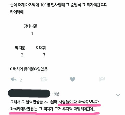 3. 사실 난 [연습생들이 순위발표식에서 호명되자 다들 알고 있었다는 듯이 딱 모여서 축하해줌 고로 주작] 이런 주장을 펼치는 사람들이 제일 황당했음