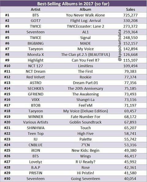 2017년에 가장 많이 팔린 앨범 순위인데 유네버워크얼론에다가 윙스도 껴있어,,,역시 슈스소년단
