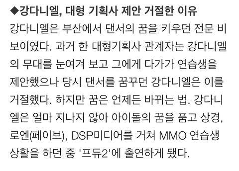 와 이때 제의 들어온거면 관계자들 눈에도 얘가 뜰 줄 알았나보다...근데 아쉽다 댄서라는 꿈이 확고했어서 좋은데ㅠㅠㅠ좀만 일찍 가수라는 꿈 키우지