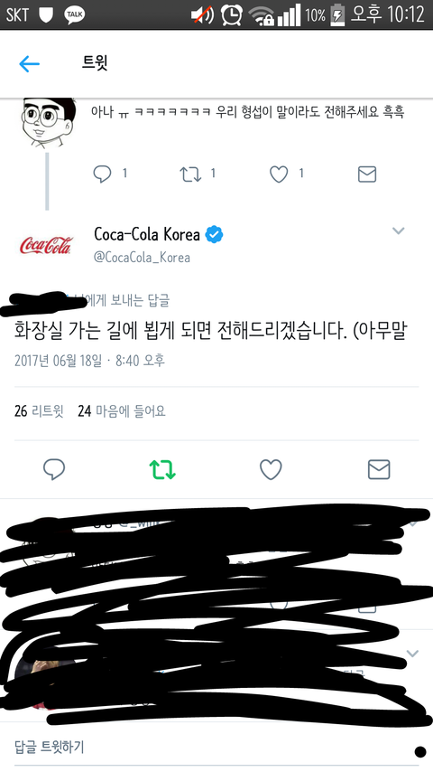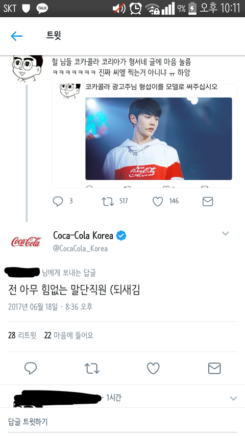형섭이 팬들이 코카콜라 광고 해달라했는데 코카콜라가 마음 누름