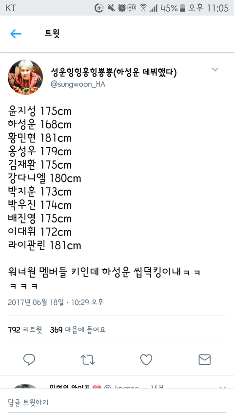 관린이 저거보다 키 더컸어 계속 183이나 184 될듯