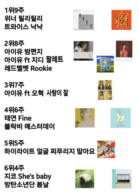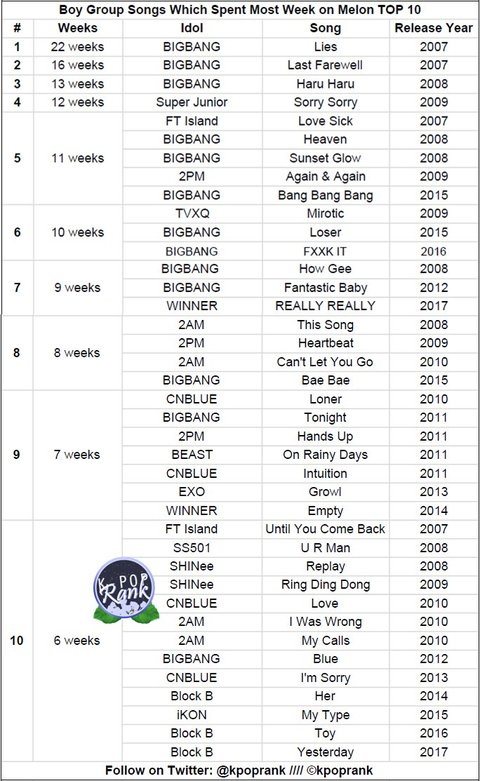 남자아이돌 멜론 주간차트 10위권 기록 순위