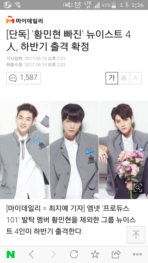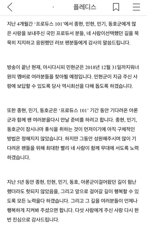 프듀가 끝나고도 민현이가 펑펑 울던게 눈에 아른거리고 너희가 헤어진다는걸 믿고 싶지 않아 하루종일 우울했는데 다행히 수많은 팬들의 사랑덕에 종현이 동호 민기가 함께하는 모습을 다시 볼 수 있어서 너무 행복하다. 그리고 민현이가 멤버들을 얼마나 사랑하는지 알기 때문에 꼭 워너원 활동 후에 민기 종현이 동호 품으로 웃으며 돌아올거라고 믿고 기다릴게:)