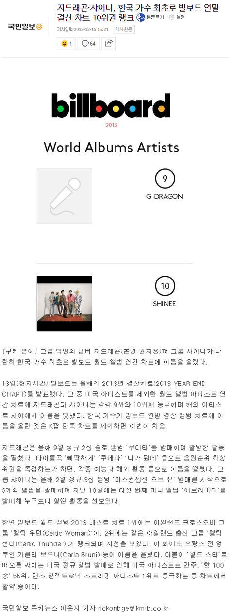 2013년 전세계 앨범판매량 연간 9위 지드래곤, 10위 샤이니