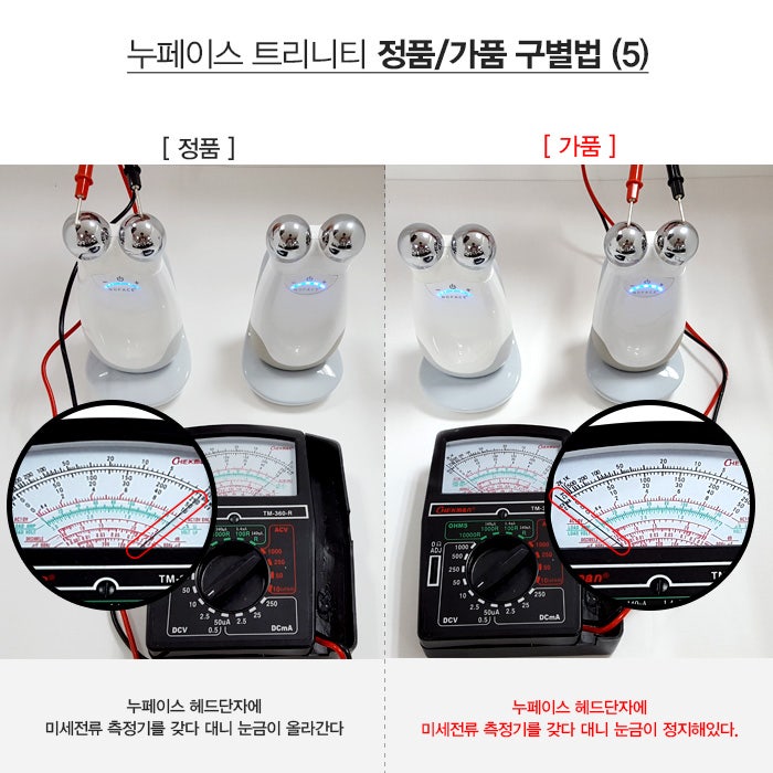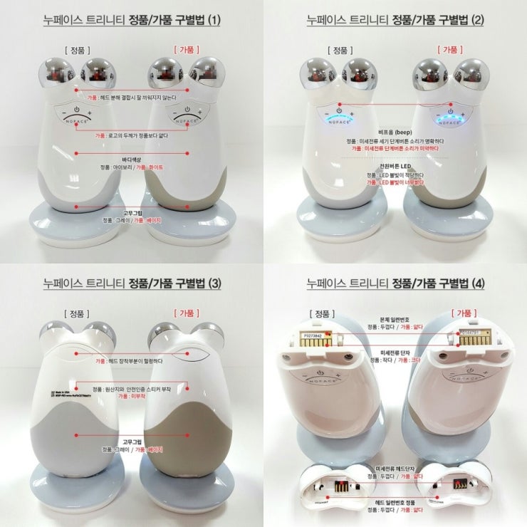 누페이스코리아 측은 누페이스 뷰티기기의 가장 큰 핵심포인트는 “미세전류”라며 가품의 경우 미세전류 측정기로 테스트를 해도 미세전류가 흘러나오지 않는다며 “겉모습을 모방 할 수는 있어도 기기 속에 있는 기술까지 카피하기는 힘들다”고 전했다. 또한 누페이스 그립부분의 색상과 미세전류 단계를 조절하는 버튼 비프음 등도 다르다! 라고 언급했다.