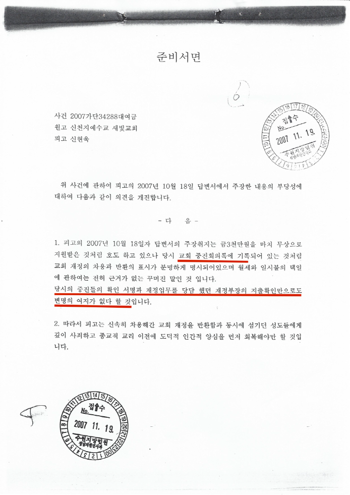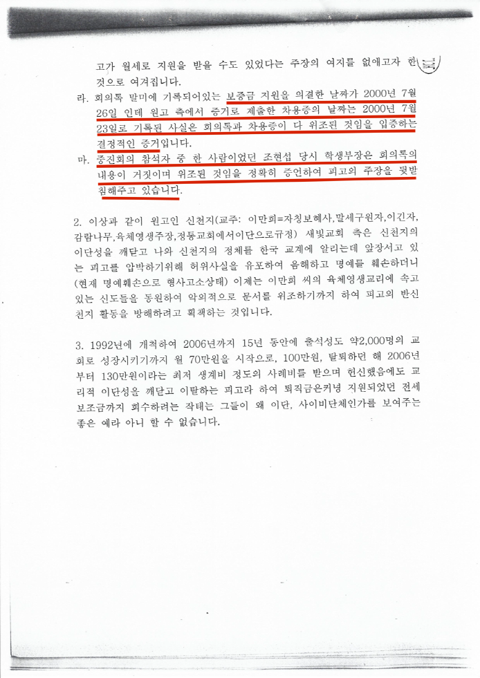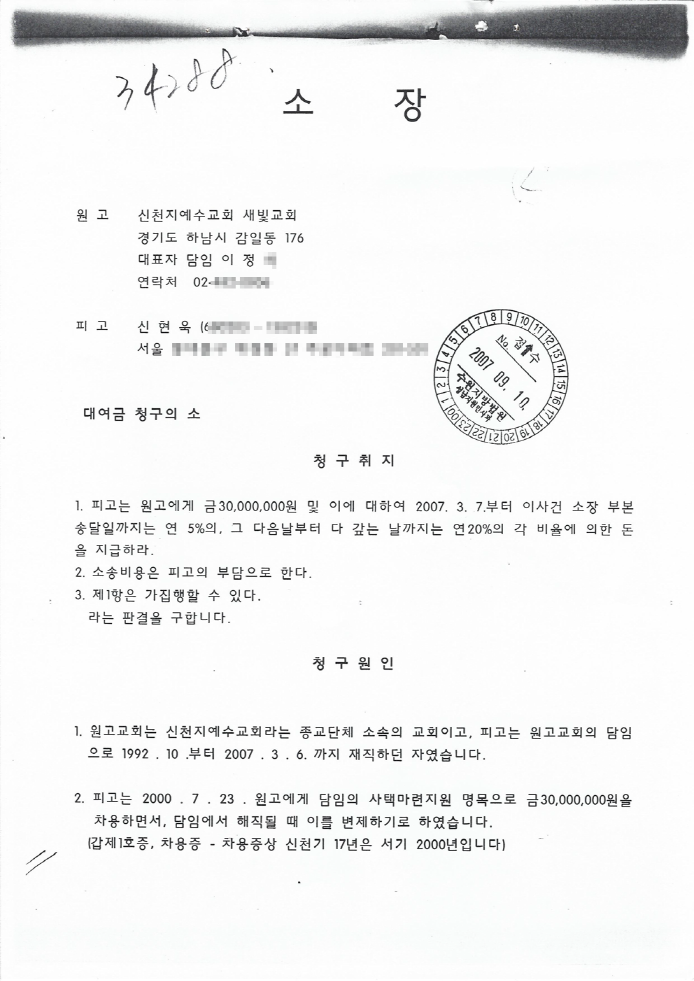 그래서 이 소송중에 신현욱 목사님은 "문형* 강사의 확인서(차용증)"도 좀 보자.. 내놔봐라.. 했지요.