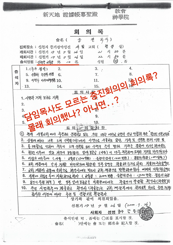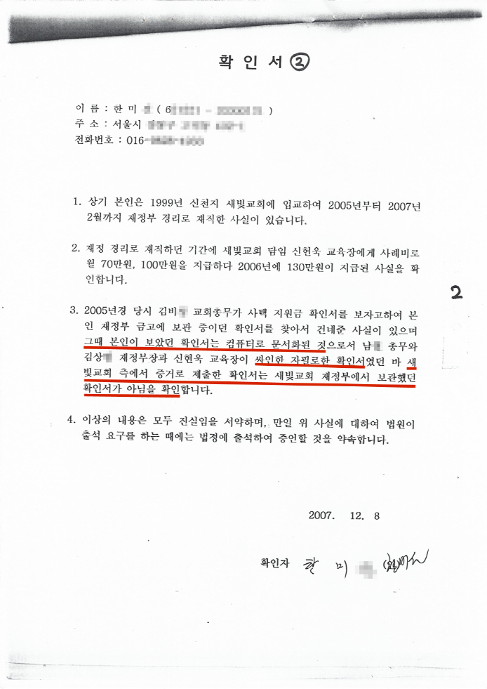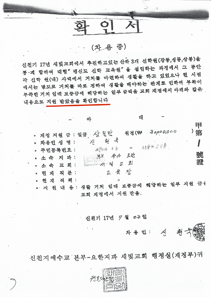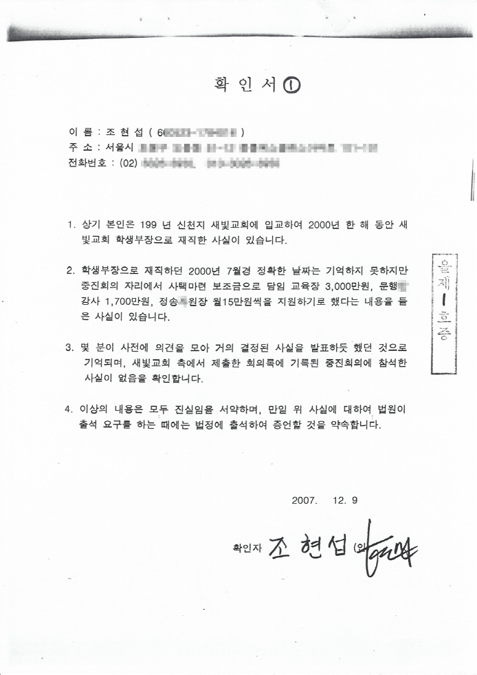 신현욱 목사님이 썻던 확인서 원본은 이것이 아니었다라고 그 당시의 경리업무를 맡은 분의 증언이 있습니다.
